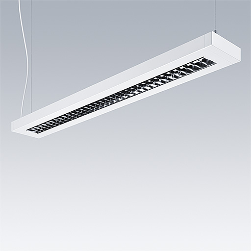 Luminaire suspendu de faible épaisseur avec distribution Direct - indirect. Electronique, non gradable. Corps : tôle d'acier, thermopoudré blanc (similaire à RAL9016). Embouts : tôle d'acier thermopoudré blanc (similaire à RAL9016). Grille : aluminium brillant. Classe électrique I, IP20, Résistance aux impacts : IK03. Connexion électrique via bornier à poussoirs. Livré avec LED 3 000 K..