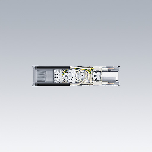 Sortie de puissance Électrique , noir. Acier rouler-formé acier pour la connexion électrique du système de rangée continue. Bornes de connexion à brancher pour 5 câbles de secteur, 2 x 2 câbles d’éclairage de secours et 2 lignes de commande. Embouts inclus.