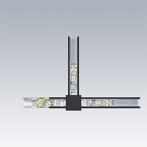 Connecteur électrique et mécanique de forme T, noir. Avec deux embouts femelles et un embout mâle pour un raccord mécanique et 3 groupes de bornier pour entrée ou sortie électrique.