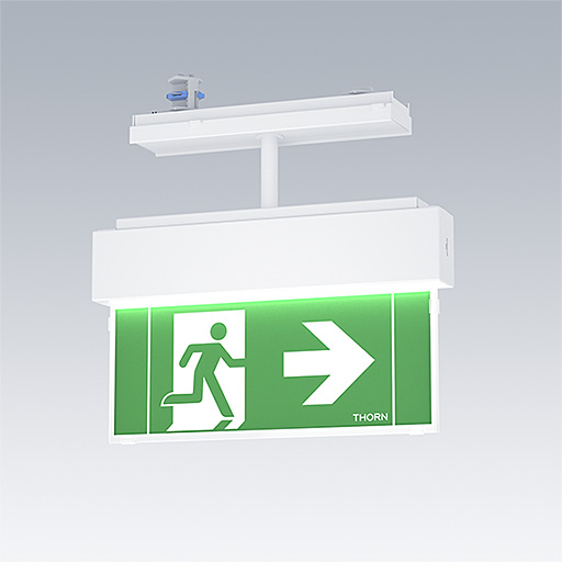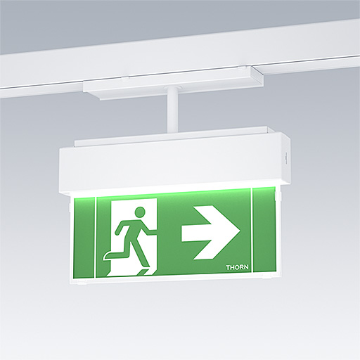 Luminaire de secours à LED avec pictogramme pour un montage sans outil sur le système de rail Contus de Thorn. Pictogramme orientable et pouvant être fixé par pas de 45°.