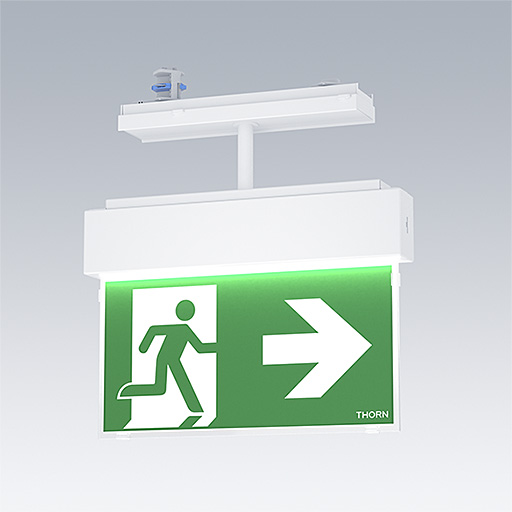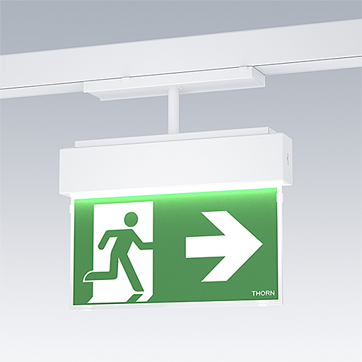 Luminaire de secours à LED avec pictogramme pour un montage sans outil sur le système de rail Contus de Thorn. Pictogramme orientable et pouvant être fixé par pas de 45°.